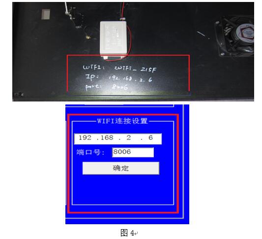 如果是第一次調(diào)試或使用軟件,建議檢查WIFI的IP地址和端口號設(shè)置是否正確,在“系統(tǒng)設(shè)置”對話框內(nèi),有“WIFI連接設(shè)置”項,框內(nèi)有IP和端口號的信息,在設(shè)備的前面板打開后,有此車轍儀的相關(guān)信息(見圖4),如果對應(yīng)就是設(shè)置正確。