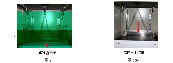 7、當做車轍試件(300㎜×300㎜×100㎜)時,將裝有車轍試樣的方形網(wǎng)籃放置到圖6-2中的打開待工作狀態(tài)下的上活動托板上,然后按照圖6-3中輔助工作狀態(tài)下標志所示將左手按住托板把手,右手推動上活動托板,讓試件置于電子天平下方,然后將方形網(wǎng)籃上的2個帶不銹鋼鏈條的S形掛鉤掛在電子天平下方的保險掛鉤上,略抬高方形網(wǎng)籃后將上活動托板往外拉回到圖6-2的打開待工作狀態(tài)。(注意不要讓S形掛鉤脫開天平的保險掛鉤)慢慢放下方形網(wǎng)籃,讓方形網(wǎng)籃內的試件完全浸入水中,待電子天平的讀數(shù)穩(wěn)定后再讀取水中質量(mw)。